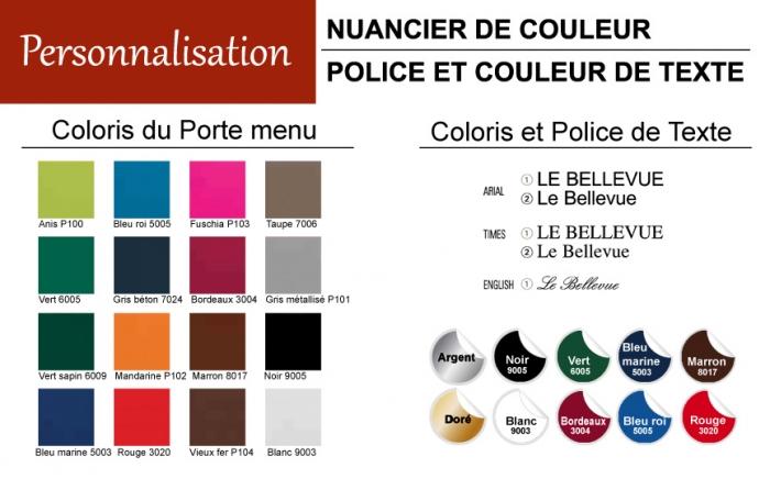 Vous souhaitez Personnaliser votre Porte-menu en choisissant, en option, la couleur, la police d'écriture et le texte parmi nos nuanciers, alors Contactez-nous pour obtenir un Devis Personnalisé ou pour tous renseignements complémentaires.